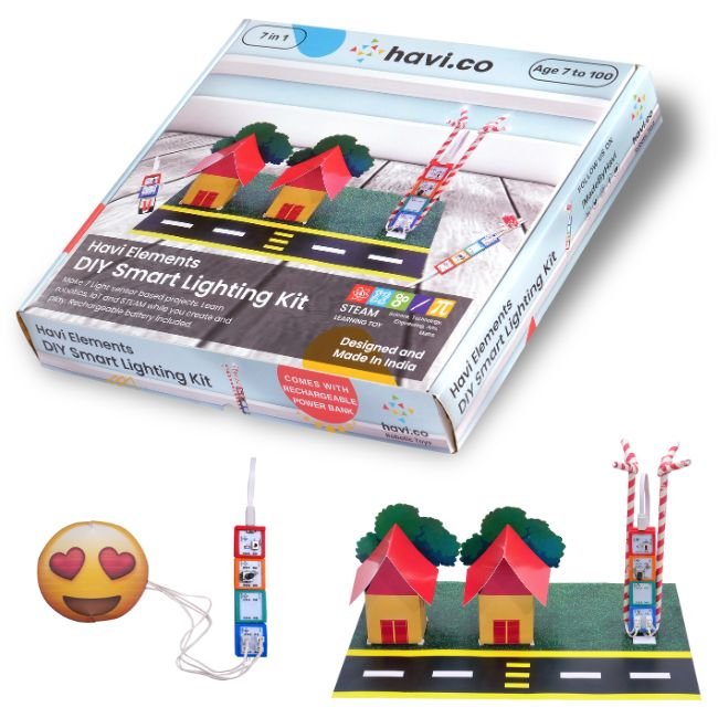 Make a smart street light working model, automatic night lamp, torch, smart greeting card and 7 such STEAM(STEM+Arts) projects using Havi Elements – DIY Smart lighting kit. Learn STEM by doing. A Robotic toy gift for kids of age 6 to 100 years.